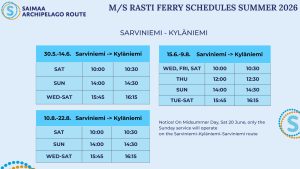 The Bike Ferry Rasti will operate as a connecting ferry from Sarviniemi to Kyläniemi and Puumala’s Lintusalo also in summer 2026.