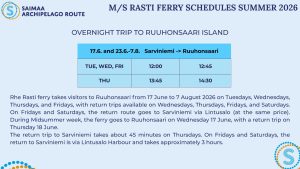 Rasti also takes you to the Ruuhonsaari excursion harbor in midsummer on Tue–Wed–Thu–Fri. Returning from the island is only possible the following day – spend the night on a Saimaa island!
